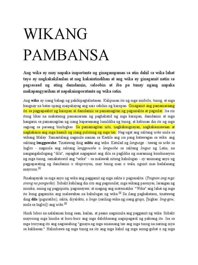 Sa paggamit ng ating sariling wika sa mga transaksyon sa ekonomiya mas magiging madali para sa mga mamamayang pilipino ang makahikayat upang makisali sa pakikipagtalastasan at mga. Ang kasalukuyang Filipino ay ang dating wika ng Katagalugan na naging pambansa. Ukol sa layunin ng komunikasyon at pagtuturo ang mga wikang opisyal ng Pilipinas ay Filipino at hanggat walang ibang itinatadhana ang batas Ingles.