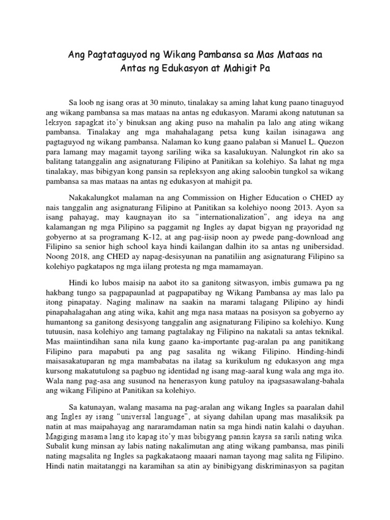 Bilang mag-aaral alam ko na hindi pa sapat ang aking kaalaman sa wikang ingles upang magpasya sa ganyan uri ng pagkakataon. Filipino 12052021 1920 jasminsexy. Mahalaga na lubos nating maintindihan na hindi basehan ng pagiging edukado sa ating bansa ang pagsasalita ng wikang Ingles lalo na at ang ating kinalakihang wika ay ang pag gamit ng wikang Filipino.