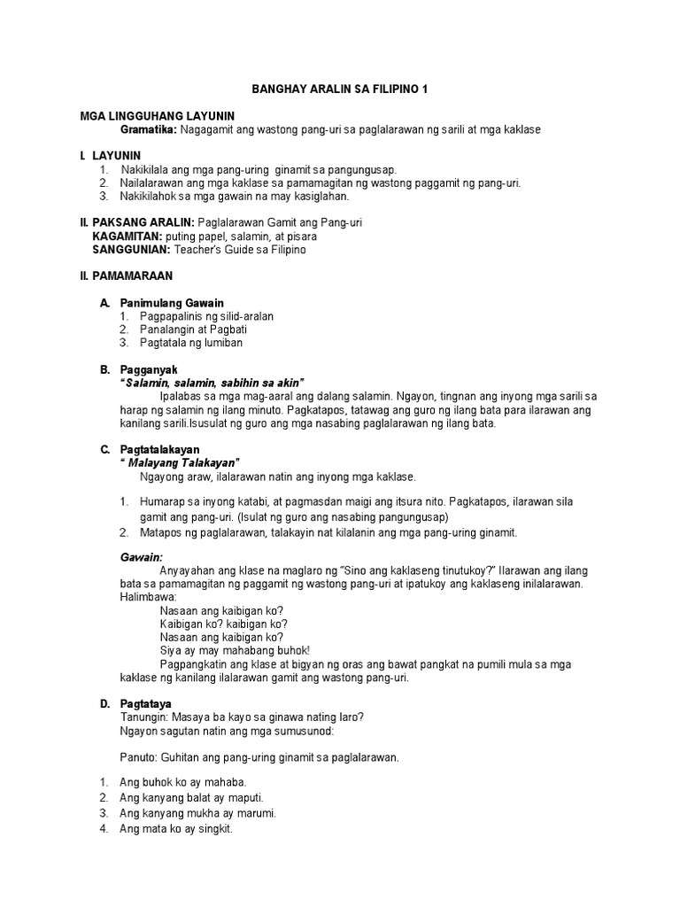Kilalaning mabuti ang mga bahagi ng banghay-aralin at masusing suriin ang nilalaman ng bawat bahagi. Hulwarang Banghay-Aralin Sa Pagtuturo ng Filipino IV. Naipaliliwanag ang tunguhin ng araling Filipino.