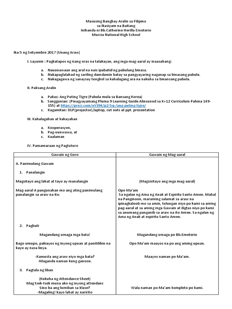 Dito nakalagay kung ano ang magiging takbo ng talakayan sa araw-araw. Layunin Sa pagtatapos ng 80 minutong pag-aaral ang mga mag-aaral ay inaasahang. Ang paggamit ng wikang Filipino sa lahat na antas ng pamumuhay ay nagbibigay ng pantay na karapatan sa bawat Pilipino mahirap o mayaman nakapag-aral man o dili na maintindihan ang mga misteryo ng buhay.