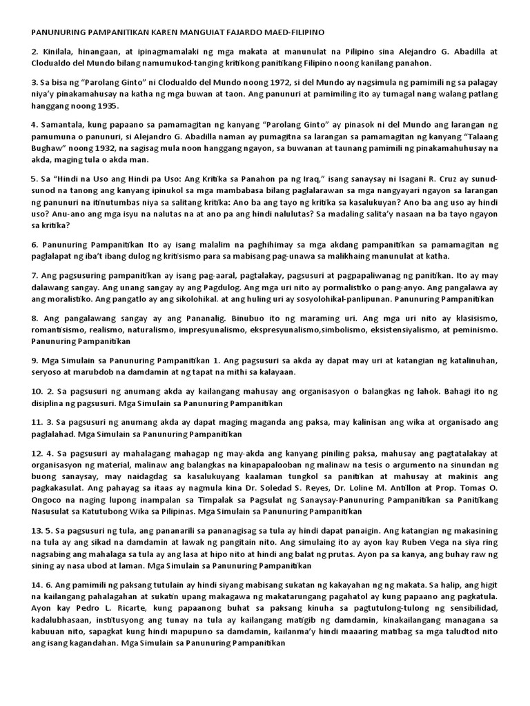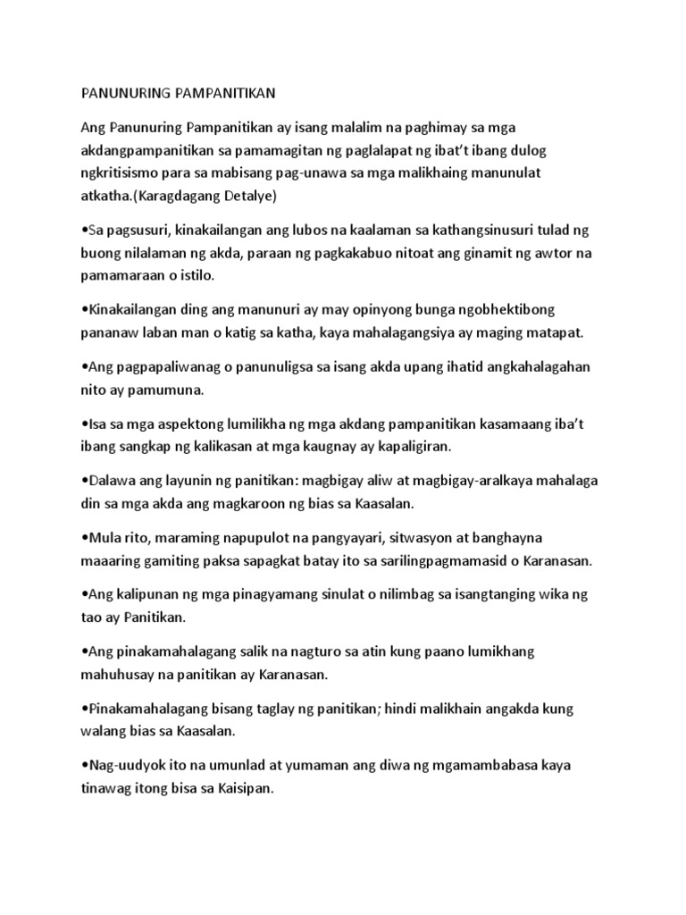 Hindi kumpleto Ang Panunuring Pampanitikan ay isang malalim na paghimay sa mga akdang pampanitikan sa pamamagitan ng paglalapat ng ibatt ibang dulog ng kritisismo para sa mabisang pag-unawa sa mga. Sa paraan na iyon mas madali nating maipapakita ang ating pagka-Pilipino. 2Ang pagsusuri sa akda ay dapat may uri at katangian ng katalinuhan seryoso at marubdob na damdamin at ng tapat na mithi sa kalayaan.