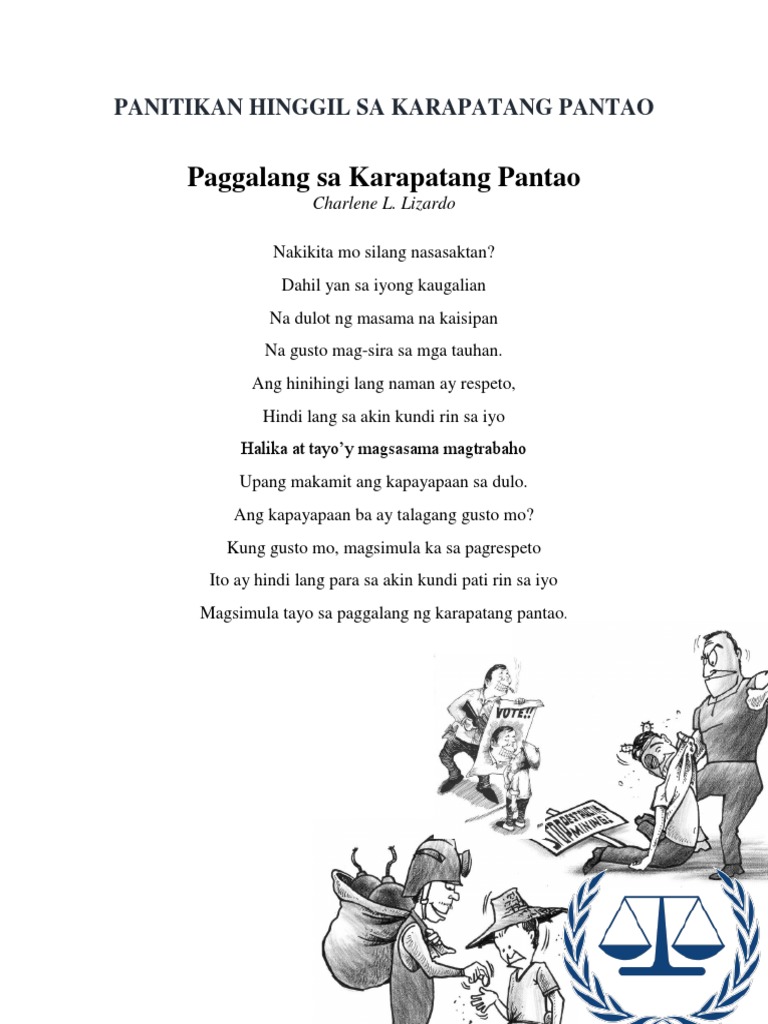 Aking karapatan ang kayamanan Aking ipaglaban kahit kailan Ito ang tungkulin iyong dapat gampanan Bukas ngayon at magpakailanman. Isang kasalanan lahat tayo may sala. Kahalagahan ng Karapatang Pantao Ang karapatang pantao ay bahagi na ng pagiging tao.