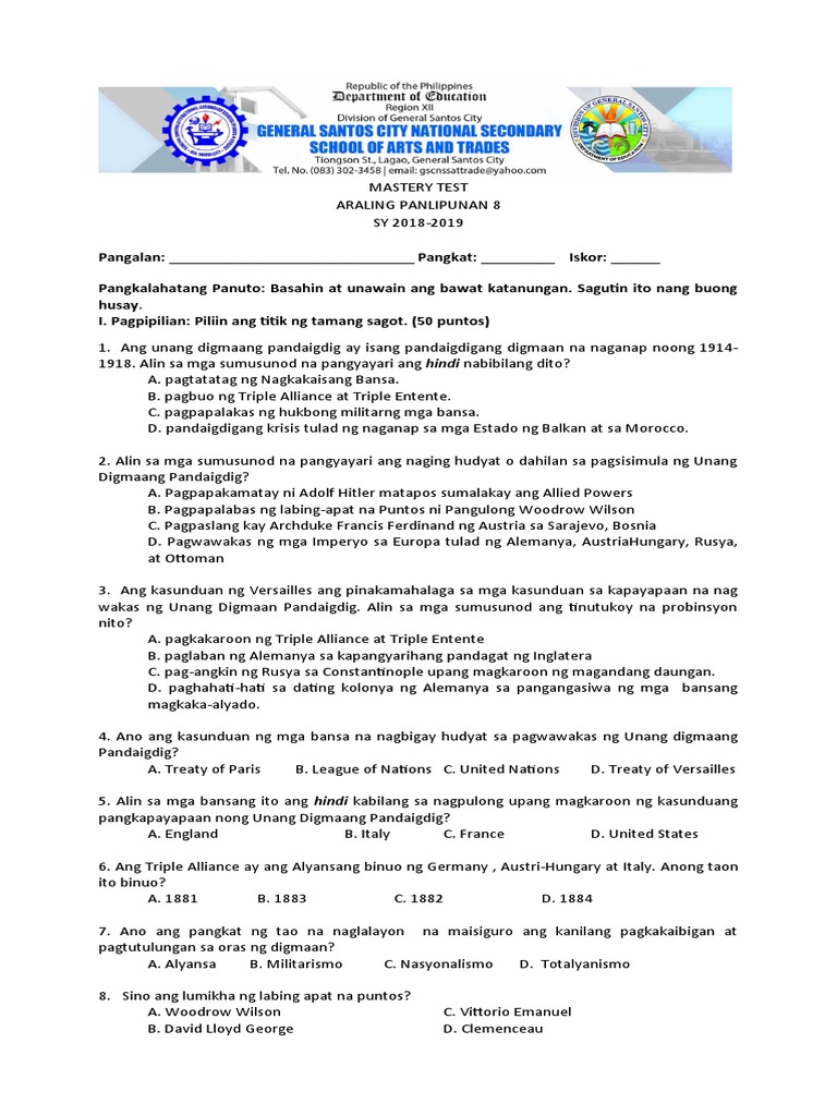 Suriin at unawaing mabuti ang bawat katanungan at pangungusap. Ang kasunduan sa Versailles ay mahalaga dahil sa probisyon nito ukol sa. Kasunduan sa Versailles pagbabawas ng hukbong sandatahan ng Alemanya sa 100000 tao lamang ng bilang ng mga barkong-pandigma nito sa anim na malalaki lamang at ilang maliliit karamihan ng mga barkong Aleman ay ibinigay sa Britanya at pagbabawal dito na magkaroon ng submarino tangke at mga eroplano.