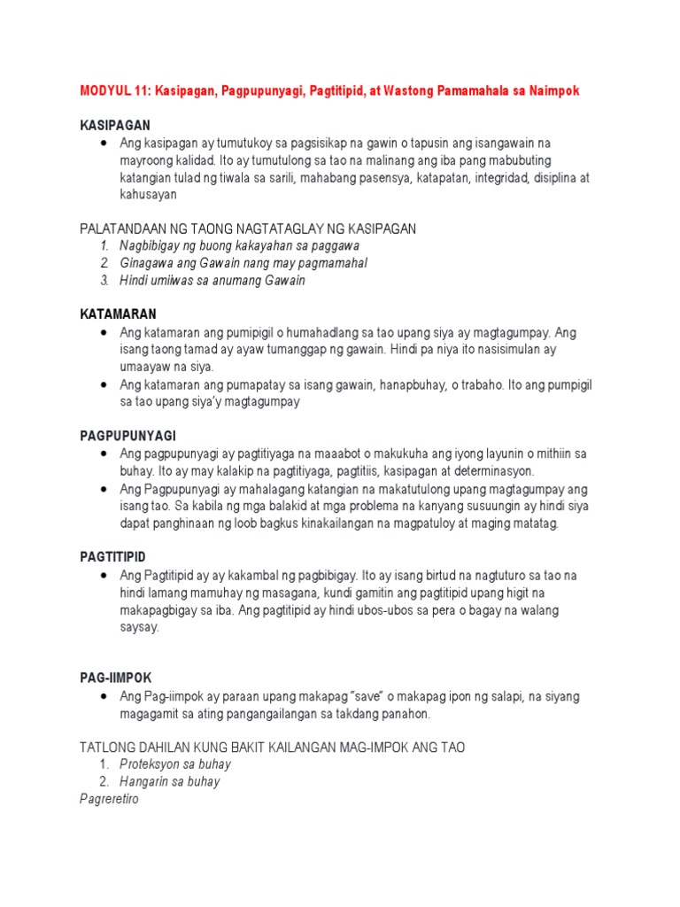 Modyul 11 Kasipagan Pagpupunyagi At Ang Tamang Pamamahala Sa Naimpok Pdf