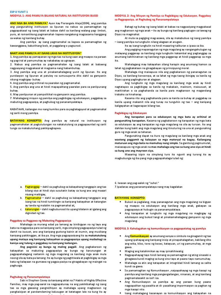 Esp 8 Yunit 1 Modyul 1 Ang Pamilya Bilan Docx