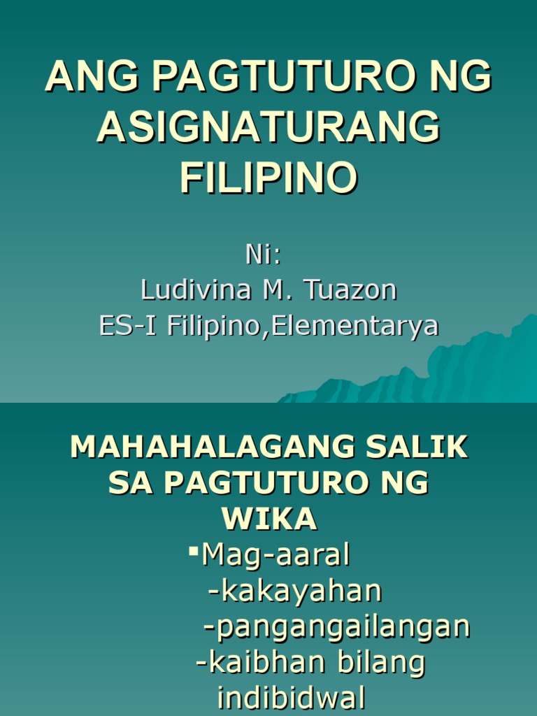 Bakit mahalaga ang pagtuturo ng wikang filipino. Sila ang magtataguyod ng wikang magbubuklod sa ating mga Pilipino at magpapakita ng kakayahan kahusayan at kabutihan nating. Ito ay nagsisilbing pagkilala sa identidad ng bawat Pilipino. Bakit mahalaga ang komunikatibong pagtuturo ng wika.