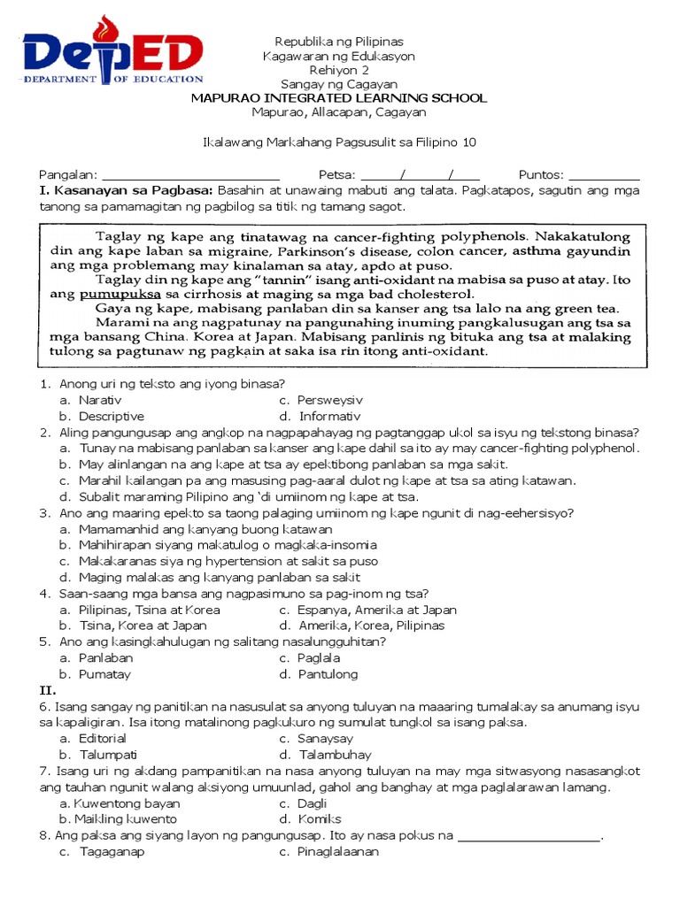 K To 12 Grade 2 Unang Markahang Pagsusulit
